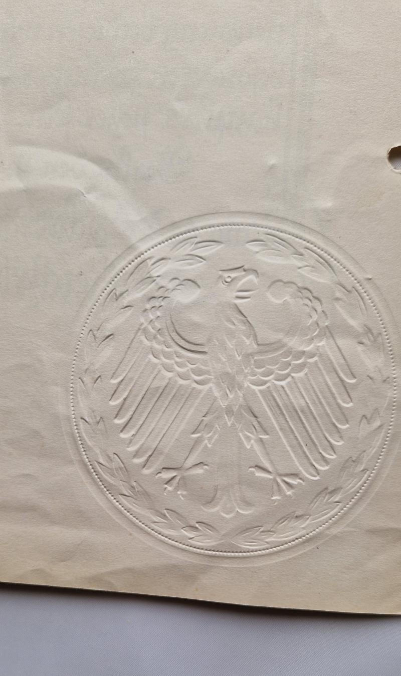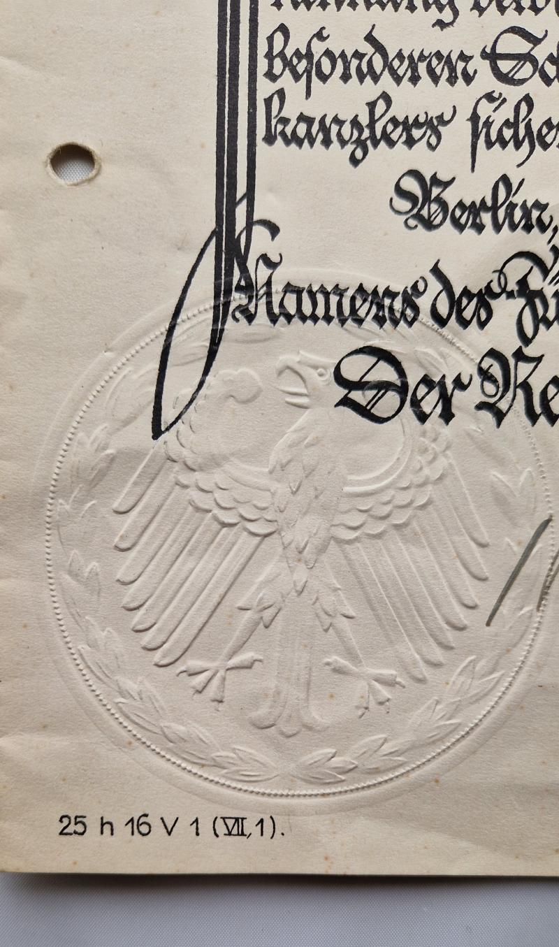 Hand signed in ink by Generalfeldmarschall Werner von Blomberg, although at the time of signing he was Reich War Minister which is shown on the citation. He was also Commander in Chief of the Wehrmacht.